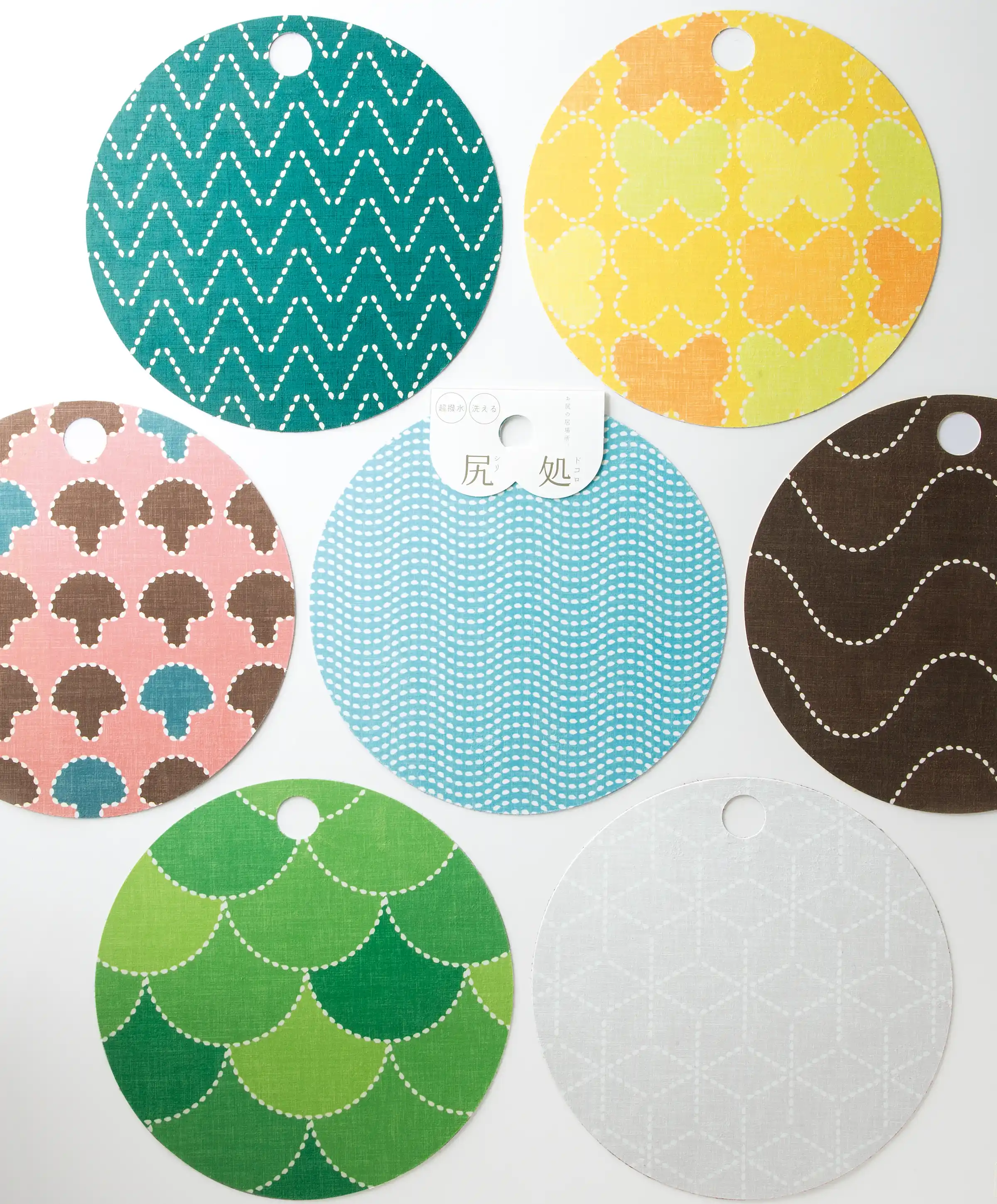 「大地の芸術祭 越後妻有アートトリエンナーレ2012」に合わせて商品化された、1人用の敷物です。越後妻有に伝わる着物の技術を活かし、屋外展示の多い芸術祭で歩き疲れたときに、気軽にひと休みできるアイテムとして制作しました。グラフィックは妻有の自然をモチーフに、米粒で描いています。商品名と台紙にも工夫を凝らし、尻型の台紙に「尻処」というネーミングを合わせることで、店頭で思わず手に取りたくなる仕掛けを加えました。