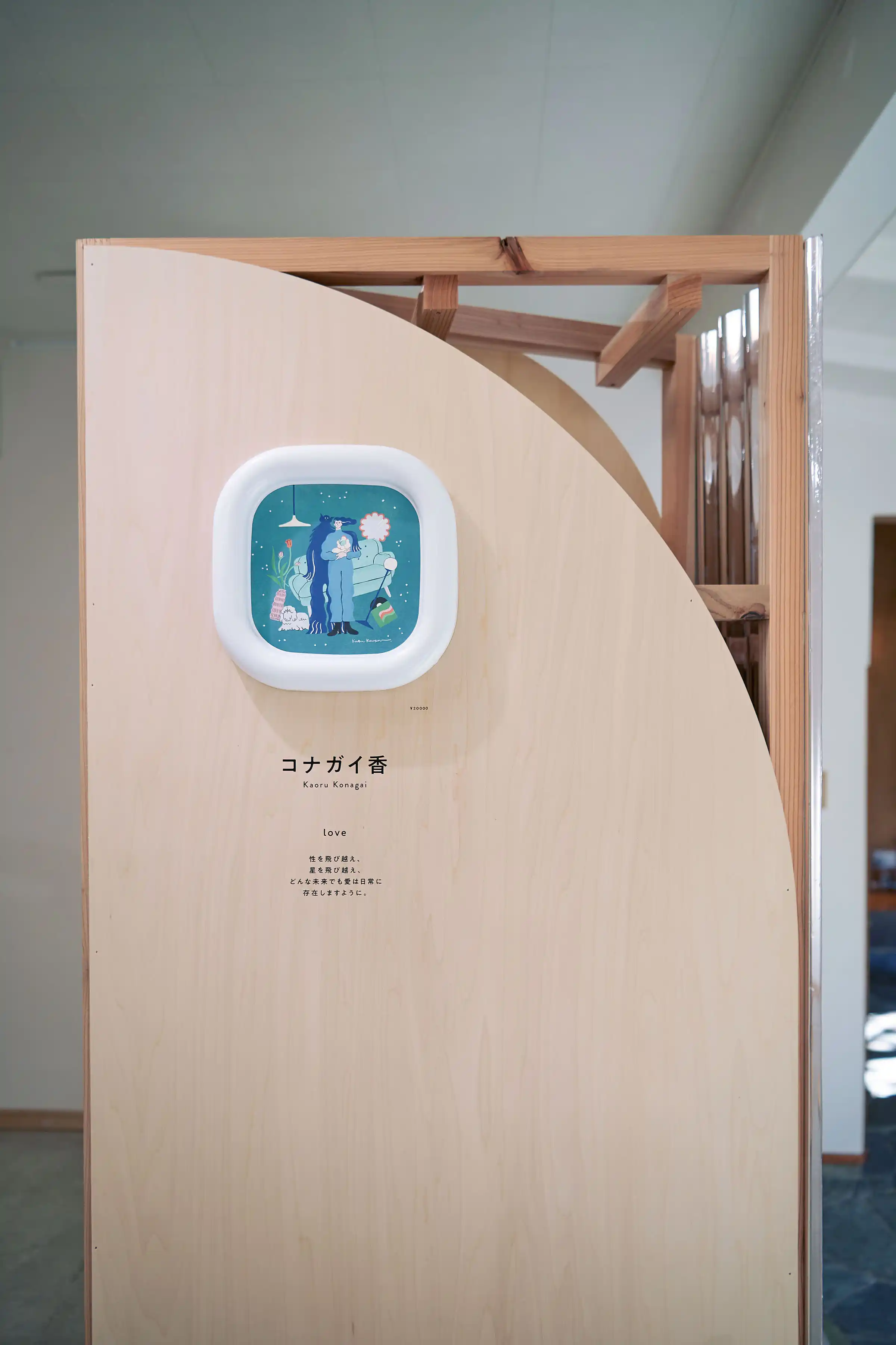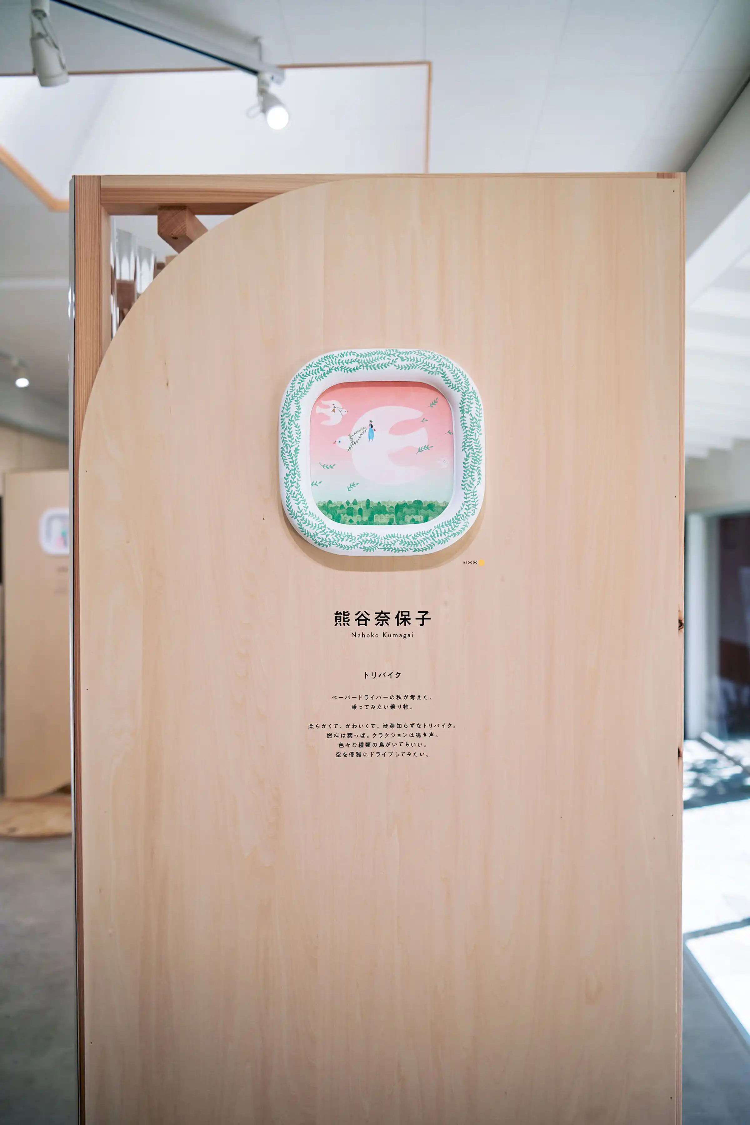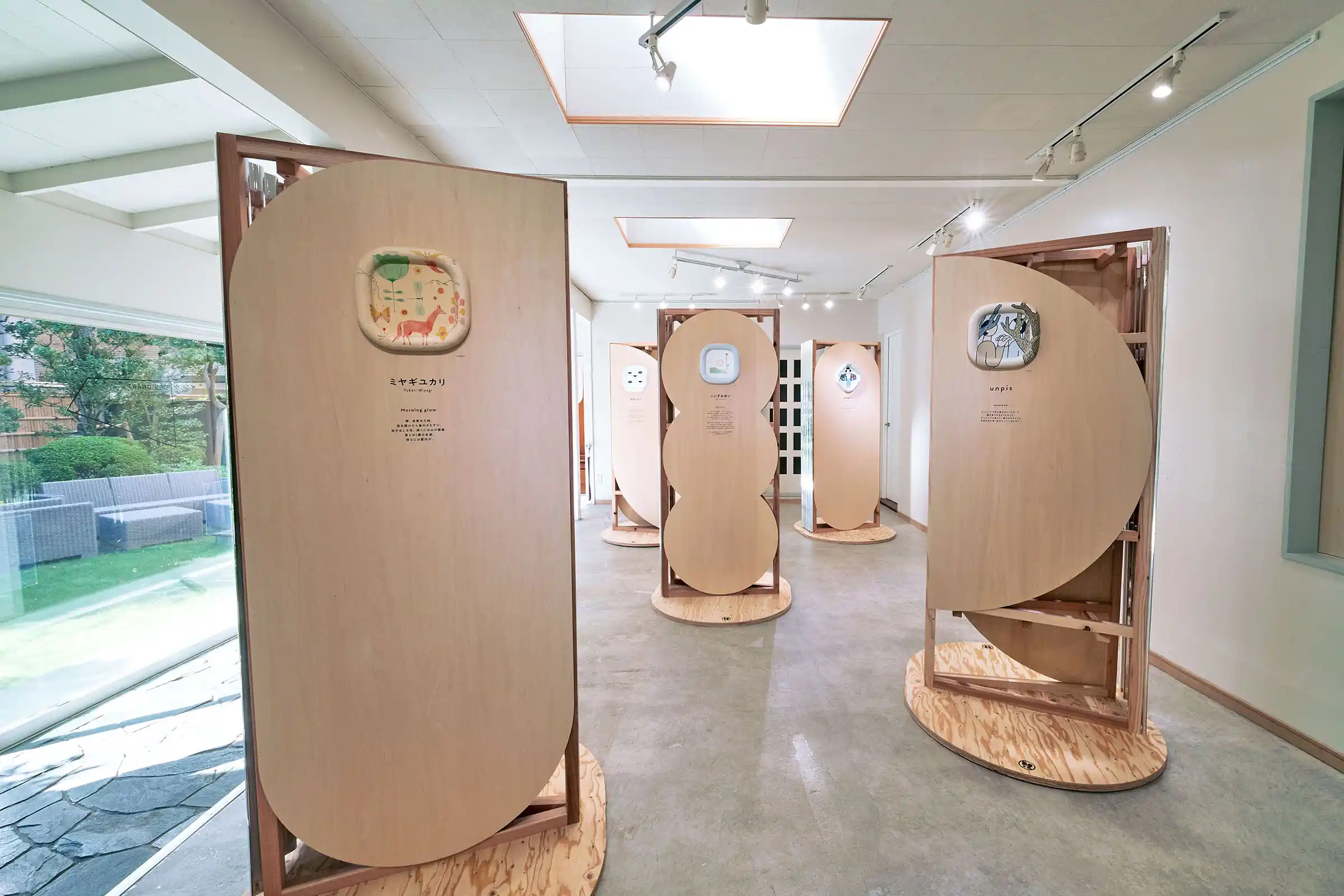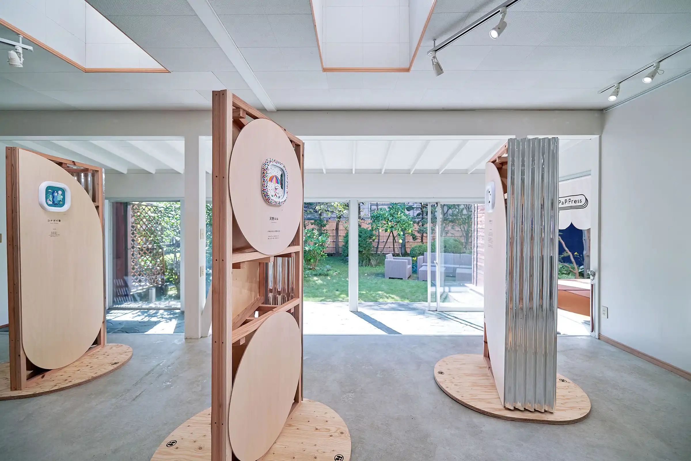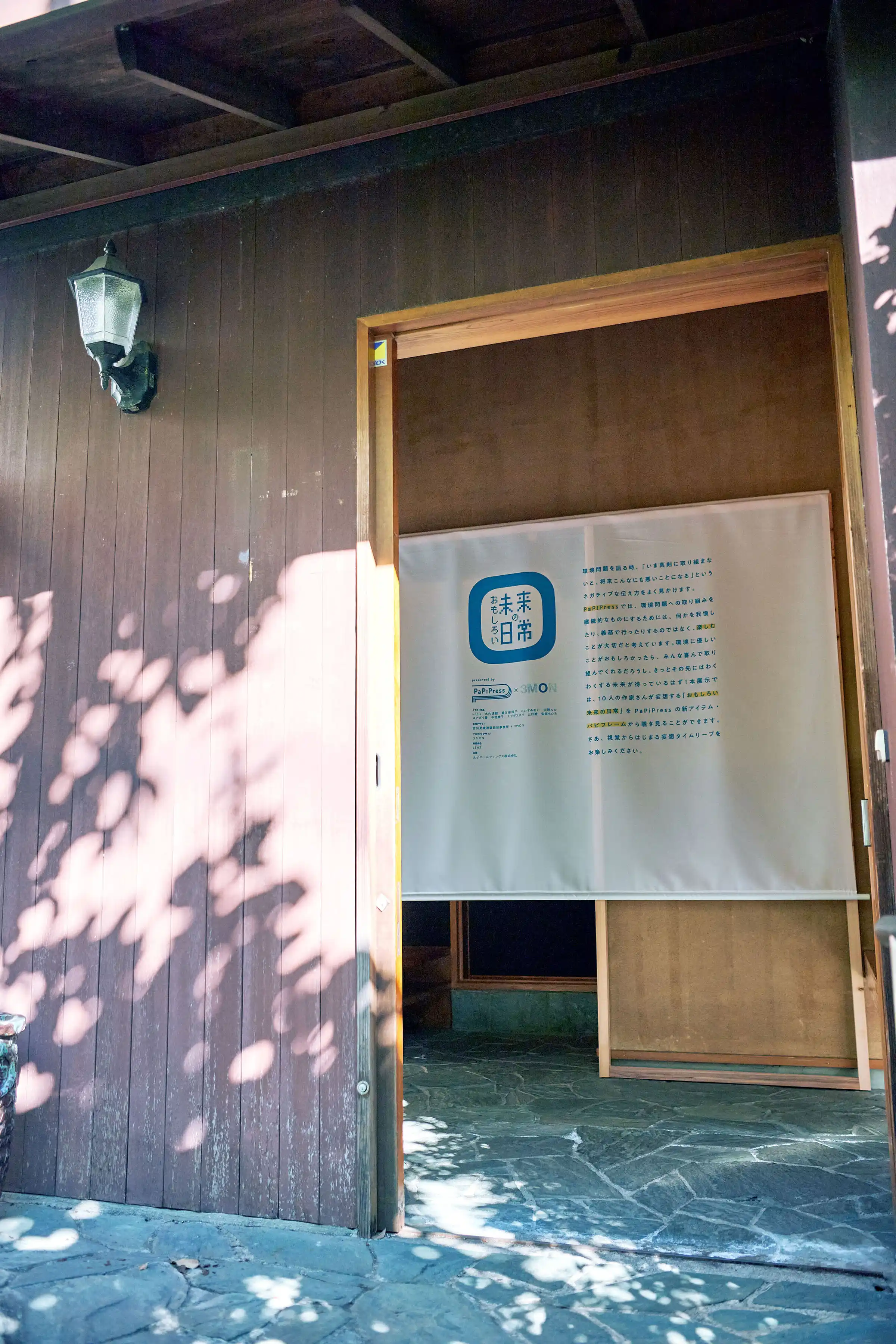 「環境にやさしいことが面白かったら、みんな喜んで取り組んでくれるだろうし、その先にはおもしろい未来が待っているはず!」という企画趣旨のもと、10人の作家さんに「おもしろい未来の日常」を描いてもらい、パピフレームに収めて展示しました。会場には和室や庭のある一軒家を選び、作品と静かに向き合える専用什器を設計しました。