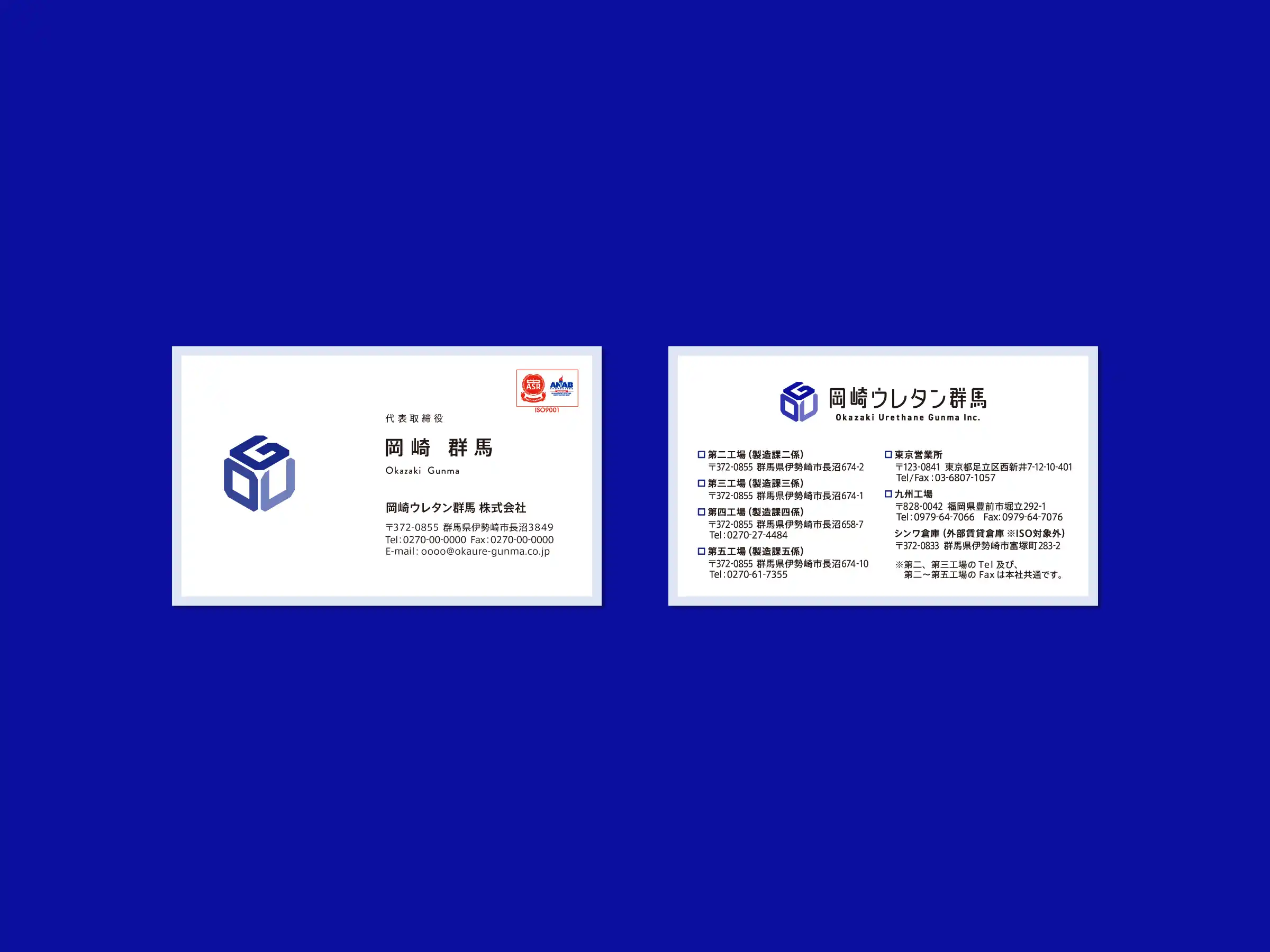 岡崎ウレタン群馬は「お客様から信頼される会社 OUG」を掲げ、品質の高さや柔軟な対応力を強みに、多品種・小ロットの生産を行っています。その姿勢を「気が利く会社」と捉え、ロゴデザインに落とし込みました。OUGをきちんとした箱型で構成し、角や文字を丁寧に面取りすることで、細部まで行き届いた安心感と誠実な仕事ぶりを表現しています。