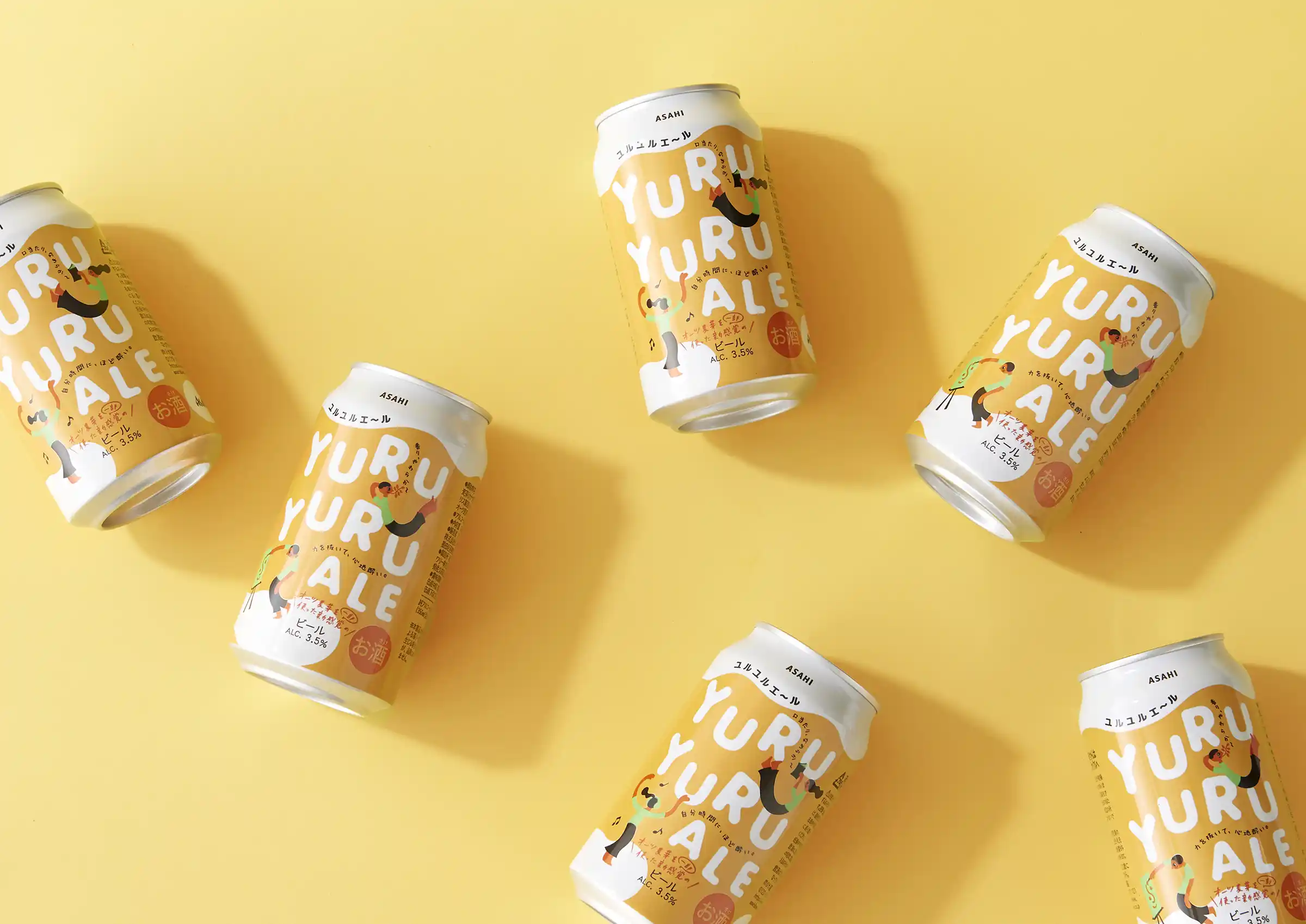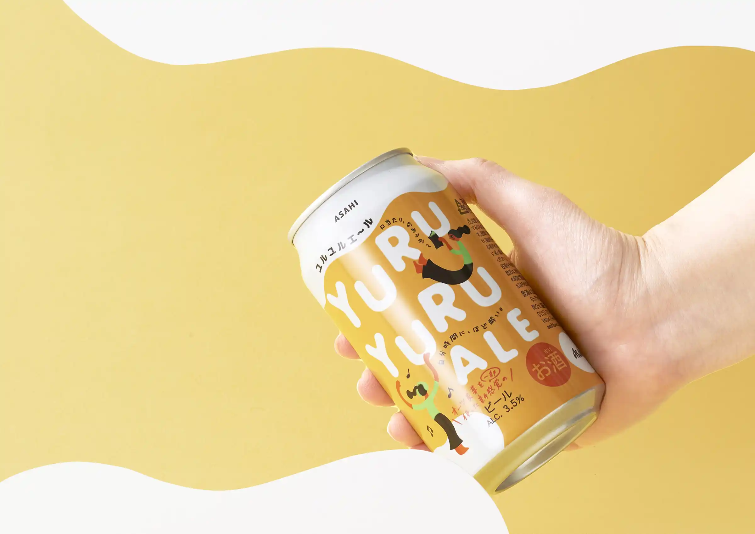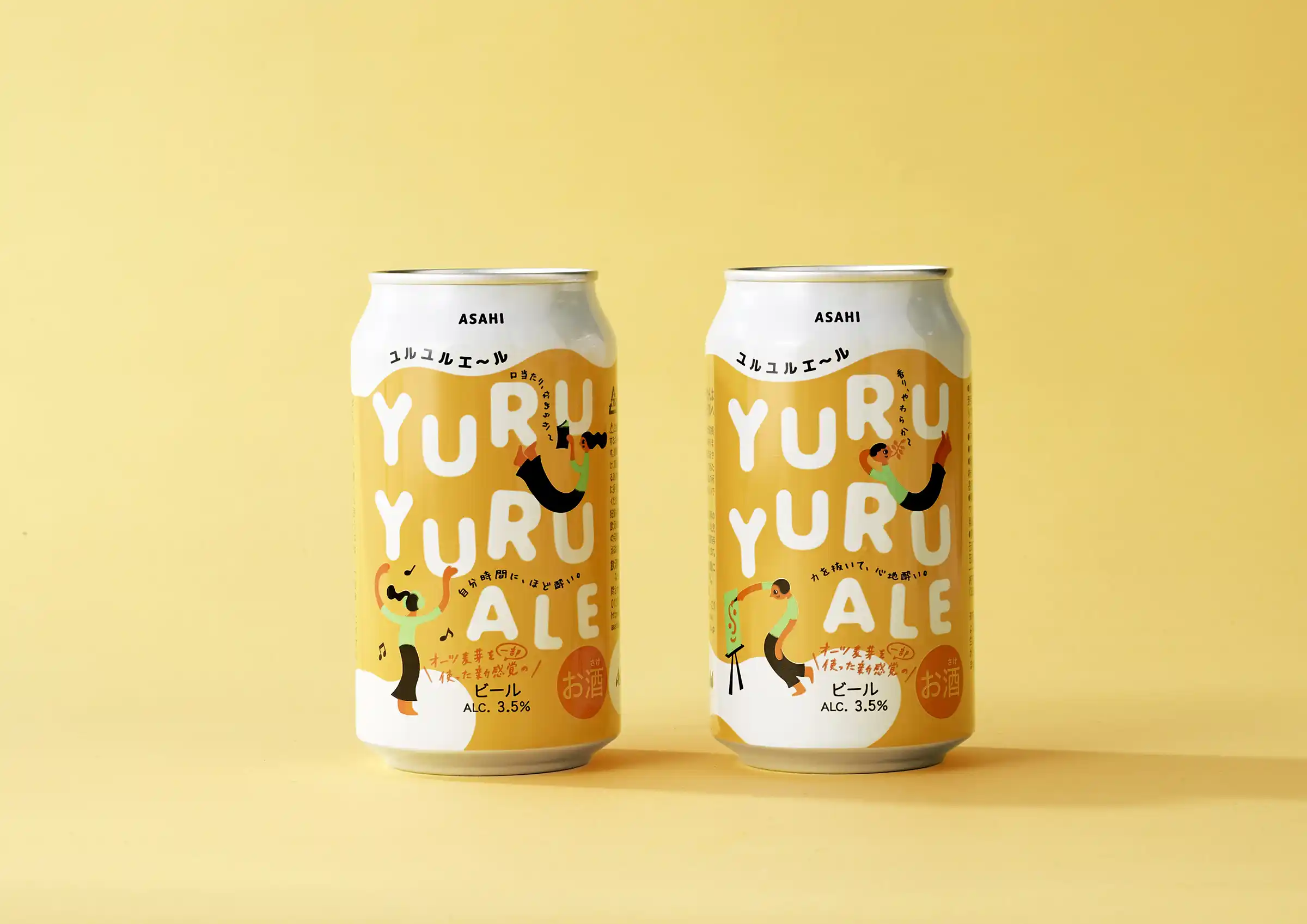 アサヒビールが「波風の少ない日に飲む、スローなビール」というコンセプトで開発した商品に携わりました。アルコールや炭酸、苦味を少し抑えた、まろやかな口当たりのビールに合わせ、「ゆるさ」を軸に商品名と世界観を構築。缶体やWEBデザインには、ビール色の空に泡の雲が浮かび、その上で人々が踊ったり読書したりと、心地よい時間を過ごす姿をゆるいイラストで描きました。よく見ると人文字で「YURU」と読める遊び心も盛り込み、アサヒビールで一番ゆるいビール「アサヒスーパーユルイ」を目指しました。